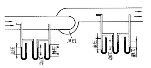 如圖所示,用 U 形壓力計測全壓和靜壓時,另一端應與大氣相通,因此壓力計上讀出的壓力實際上是風道內氣體壓力與大氣壓力之間的壓差(即氣體相對壓力)。大氣壓力一般用大氣壓力表(即巴羅表)測定。