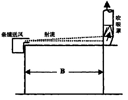 吹吸罩是利用射流作為動力,把有害物輸送到排風罩口再由其排除,它是依靠吹吸氣流的聯合工作進行有害的控制和輸送。在中包的一側設置吹風口,在另一側設置吸風口,吹風口布置在操作人員一側,如圖1所示。