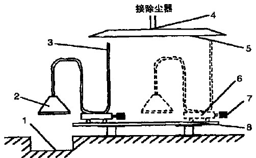 (2)兩級移動式上吸罩結構并不太復雜,只是需要裝設一個可在軌道上推行的小車。捕塵效果比前兩種好,其缺點是在移動管與上部長形吸塵罩之間會有少量的漏風。如果空間位置狹小,投資費用有限。對環保有所要求的場所,可以采用這種吸塵罩。