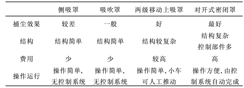 (1)側吸罩、吸吹罩結構_為簡單,可以不設置控制系統,人手動操作,費用_節省,但捕塵效果差。如果投資費用有限,對環保要求不高的場所,可以考慮選用吸吹罩。如翻車機翻卸物料時,可以采用這種簡單的吸吹罩。