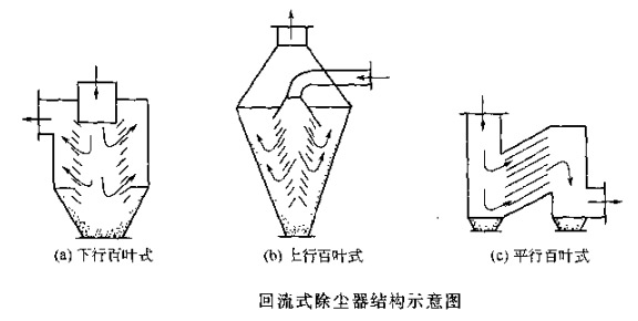 (2) 回流式除塵器結(jié)構(gòu)形式 該除塵器特點(diǎn)是把進(jìn)氣流用擋板分割為小股氣流。為使任意一股氣流都有同樣的較小回轉(zhuǎn)半徑及較大回轉(zhuǎn)角,可以采用各種擋板結(jié)構(gòu),_典型的便如圖所示的百葉擋板。